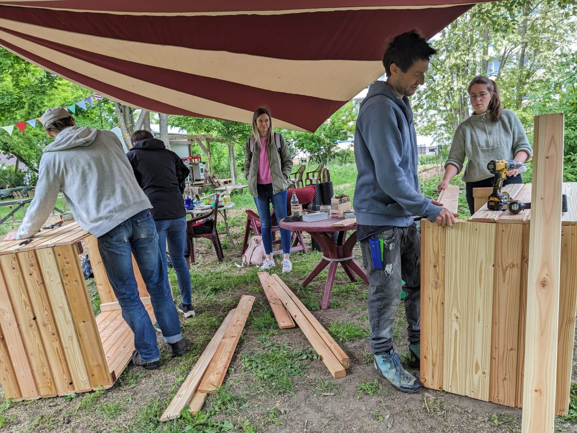 Anfang Mai haben wir im Rahmen des Freiwilligentags gemeinsam mit vielen Helfer:innen drei neue Hochbeete gebaut. Trotz des leichten Regens sorgte unser frisch aufgehängtes Sonnensegel dafür, dass wir trocken arbeiten konnten. Später im Monat haben wir gemeinsam mit der Anstiftung einen Workshop zum Thema „Verstetigungsmöglichkeiten von Gemeinschaftsgärten” durchgeführt, in dem wir uns mit Aktiven aus anderen Nachbarschaftsgärten über unsere Erfahrungen austauschen konnten.
