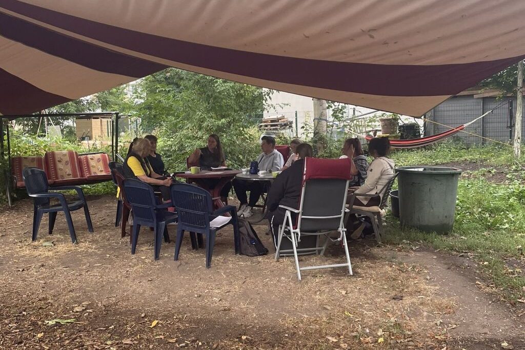 Der September begann mit der Aktionswoche Trotha, im Rahmen derer wir unser Baumhaus extra gesichert und zusammen mit Kindern dekoriert haben. Später im Monat haben wir beim Dialogformat „Dazusetzen und Mitreden” zusammen mit der Freiwilligenagentur zum Austausch über Trotha eingeladen. Wir hatten die Gelegenheit, gemeinsam mit den Bewohner:innen alte Bilder des Viertels anzuschauen und zu sehen, wie sich der Stadtteil verändert hat. Im September haben wir uns dem Team des Bauspielplatzes angeschlossen, um zusammen eine regelmäßige „Hort-AG” für Kinder der Hans-Christian-Andersen-Schule zweimal monatlich zu leiten und den Kindern gärtnerische Themen näherzubringen.