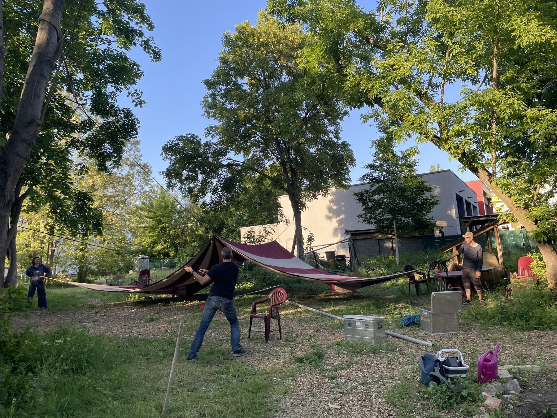 In den Sommerferien ging es mit dem Schuppenbau für unsere Geräte sowie mit mehreren Angeboten für Kinder und Jugendliche weiter: einem Sound-Workshop unter der Leitung von Dorli, einer Ferienwoche beim Bauspielplatz und einem Sommercamp, das von der Eltern- und Nachbarschaftsinitiative organisiert wurde. Auch die Bürgerstiftung hat zum zweiten Mal einen Zirkus-Workshop organisiert, bei dem wir wieder sehr gerne Gastgeber waren.